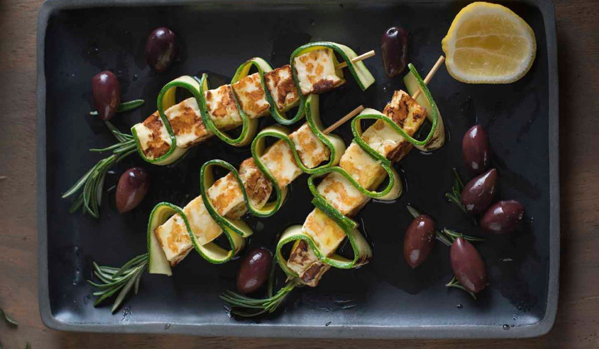 Skewer up the Haloumi alternating with the folded ribbons of courgette.